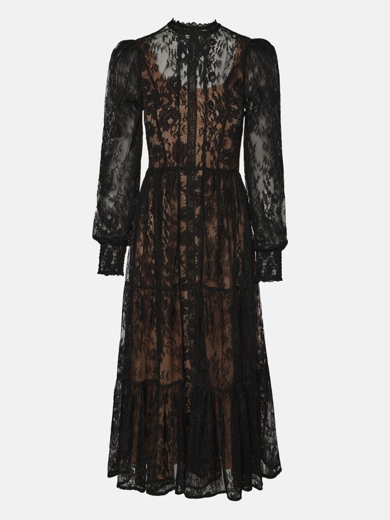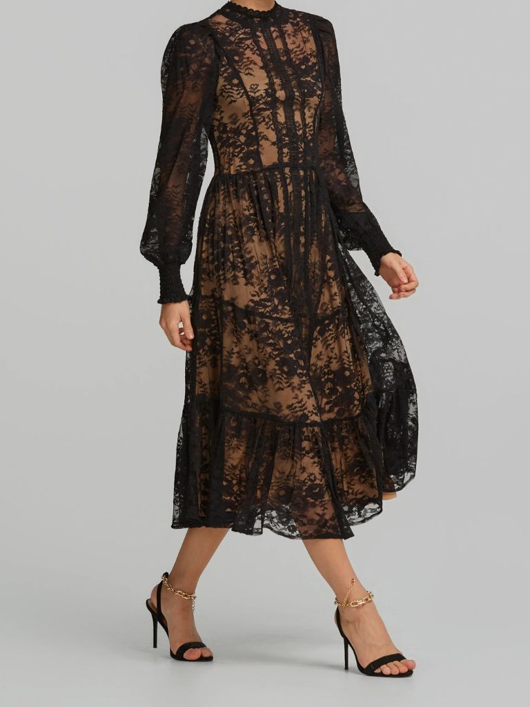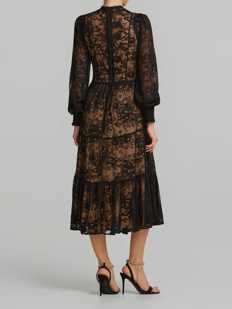 Μαύρο φόρεμα από δαντέλα με εσωτερική επένδυση σε αντίθεση. Μακριά έντονα μανίκια βολάν στο τελείωμα.