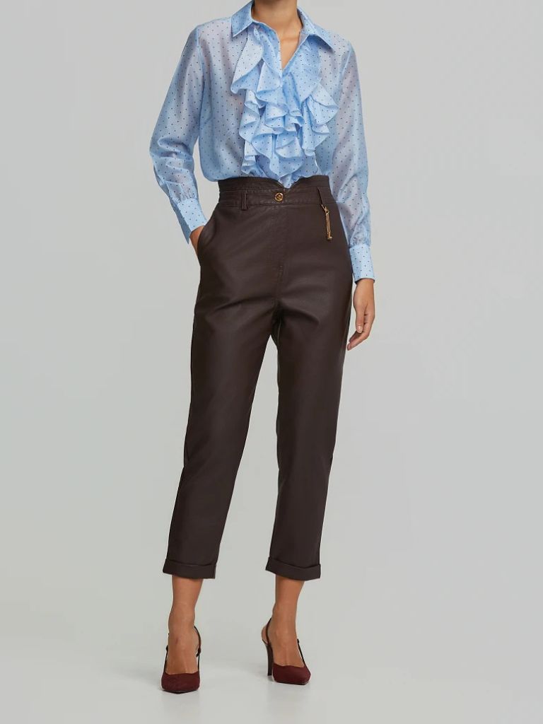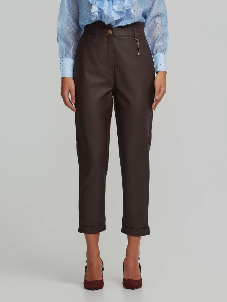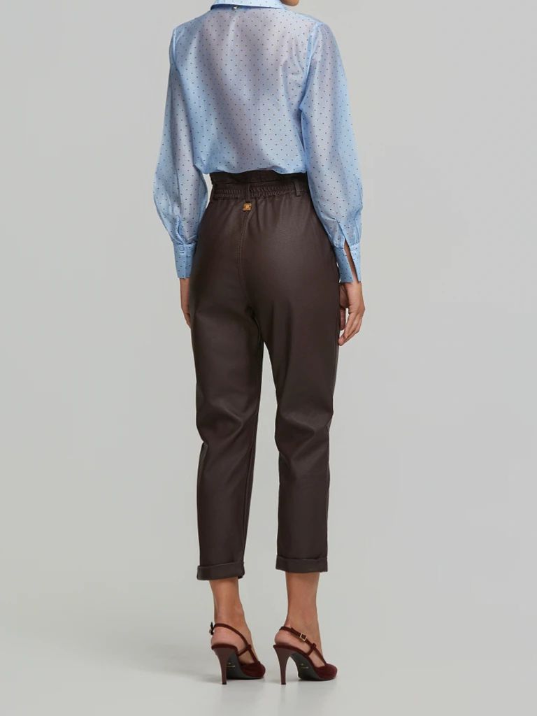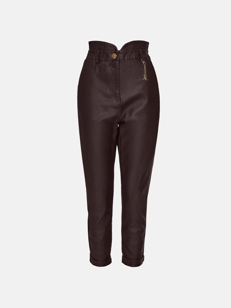 Baggy ψηλόμεσο κροπ παντελόνι με δερμάτινη όψη και ελαστική μέση. Πλαϊνές τσέπες και αποσπώμενο logo Charm.