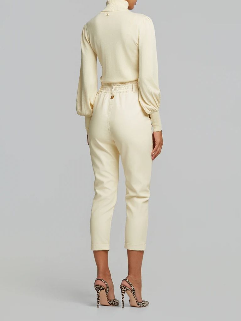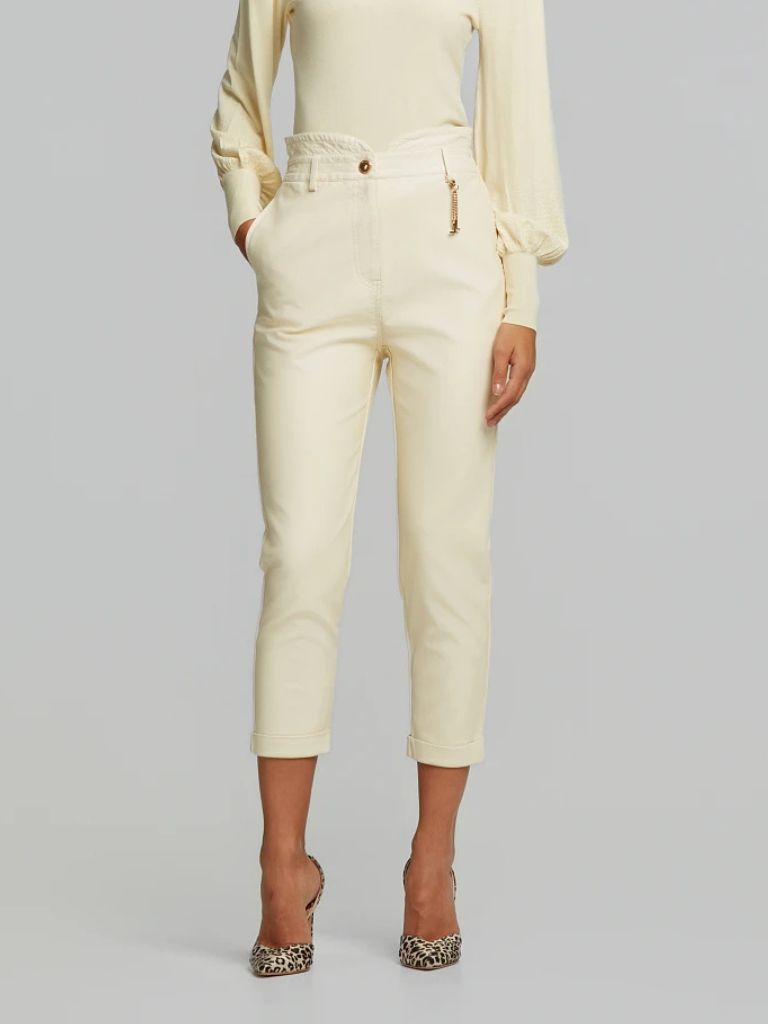 Baggy ψηλόμεσο κροπ παντελόνι με δερμάτινη όψη και ελαστική μέση. Πλαϊνές τσέπες και αποσπώμενο logo Charm.