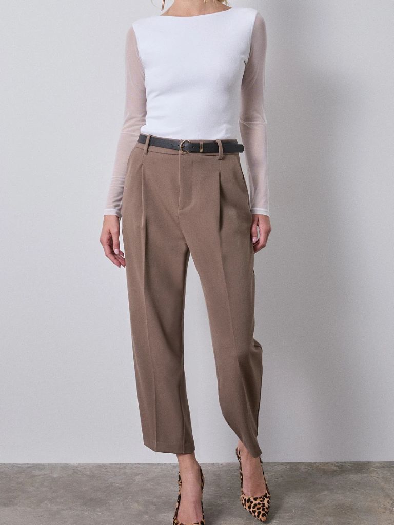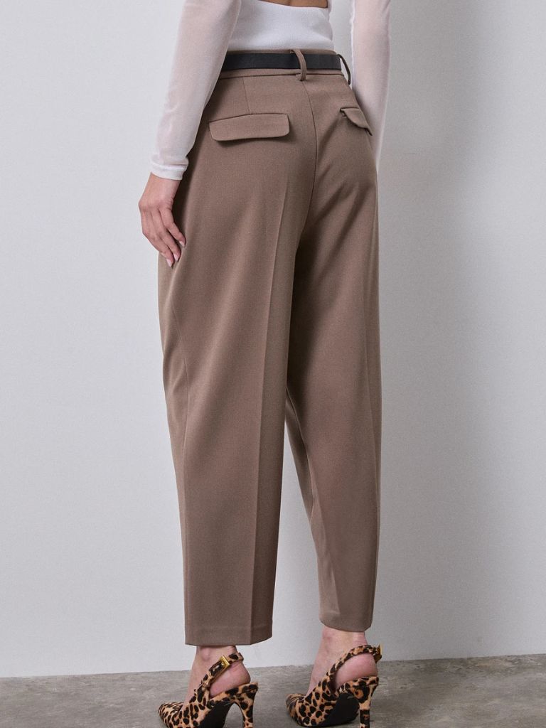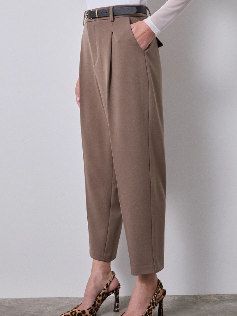 Barrel παντελόνι, με αποσπώμενη ζώνη. Κλείσιμο με κουμπί και φερμουάρ. Έχει πιέτες, με κανονική εφαρμογή.