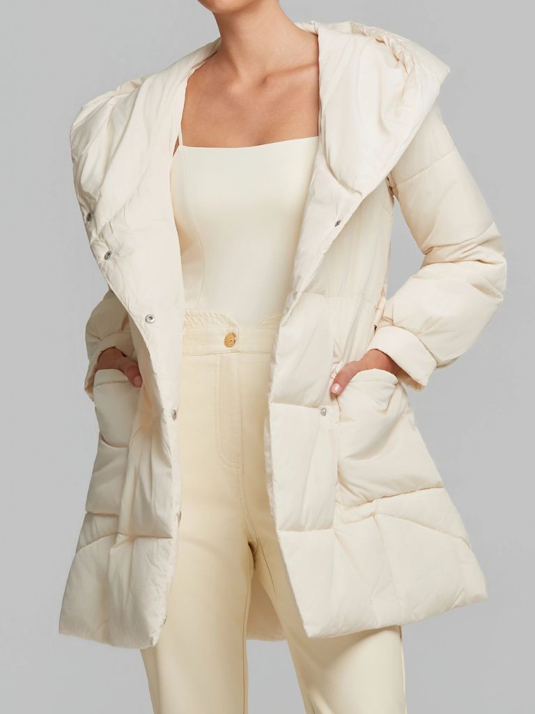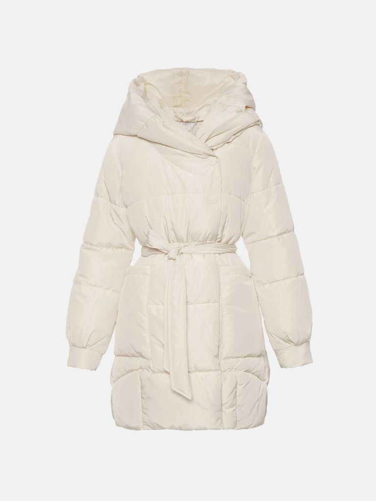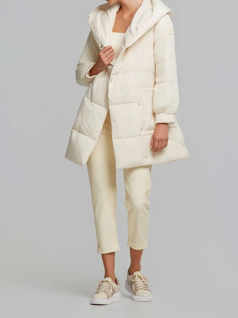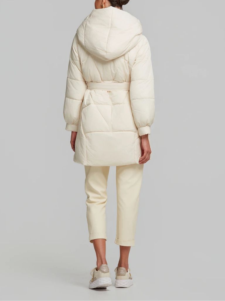 Μπουφάν με έντονη κουκούλα μεσαίου μήκους και αποσπώμενη ζώνη. Πλαϊνές τσέπες, με άνετη εφαρμογή.