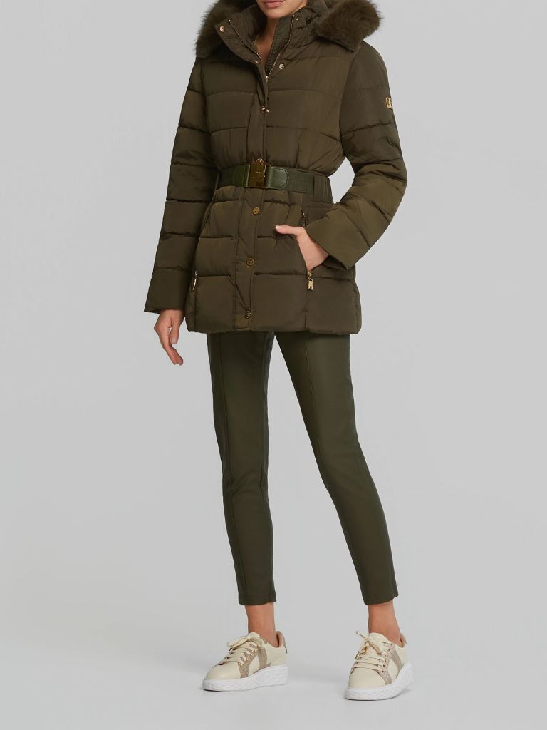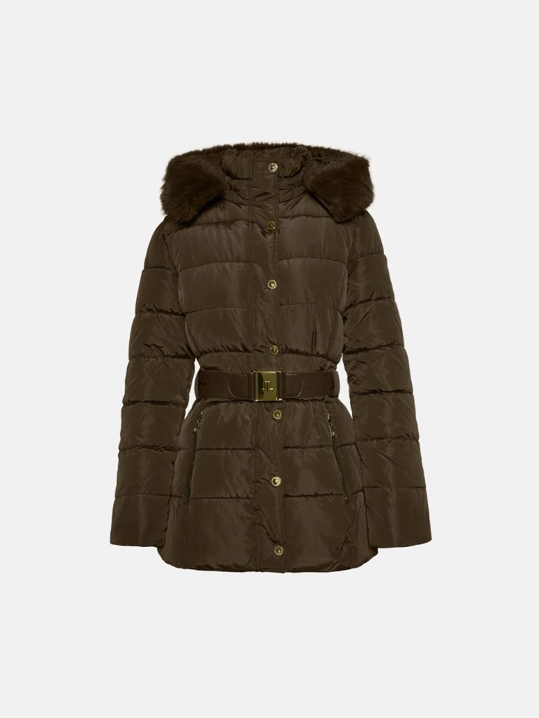 Μπουφάν με αποσπώμενη κουκούλα και διακοσμητική faux γούνα. Ζώνη με μεταλλική αγκράφα και πλαϊνές τσέπες.