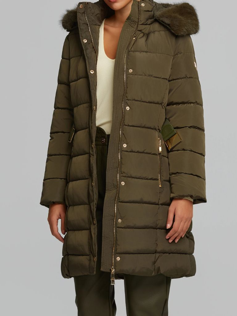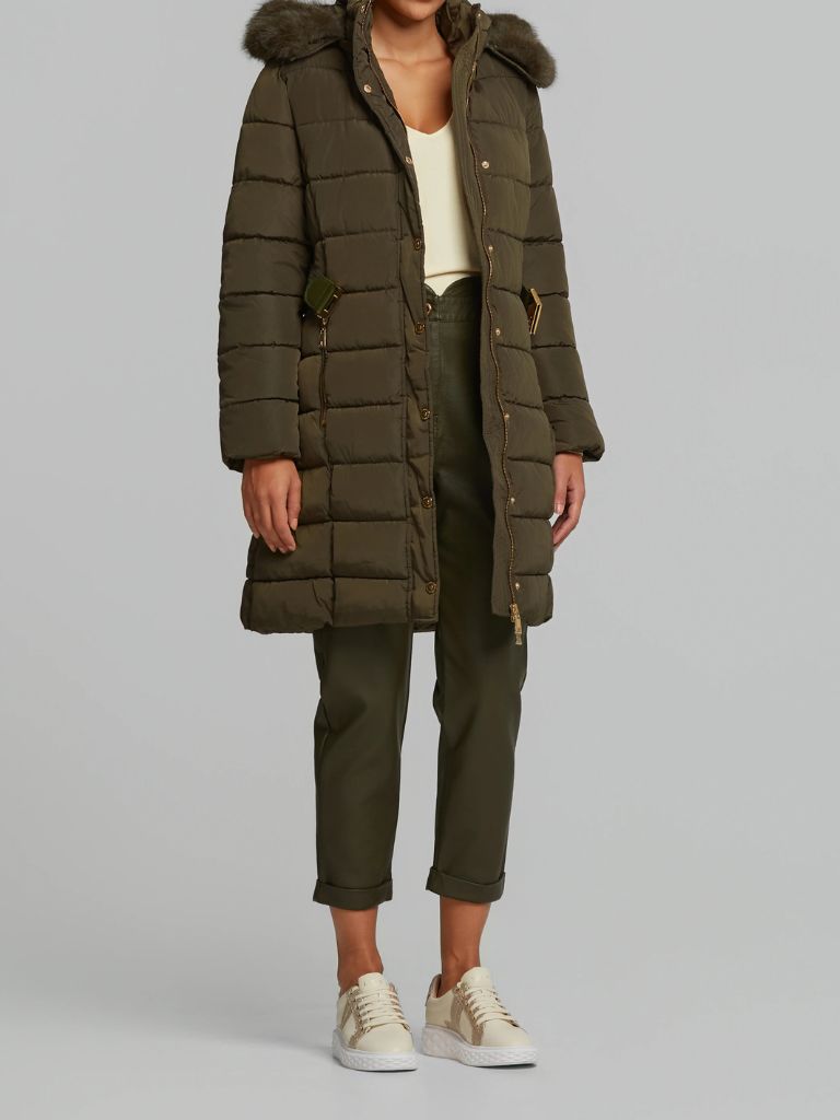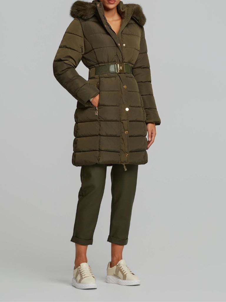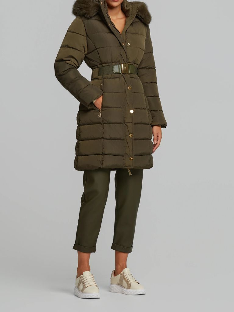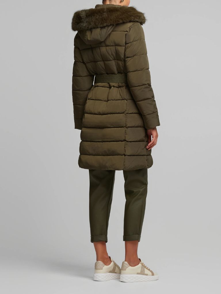 Μακρύ μπουφάν με ζώνη και ψηλό γιακά διακοσμημένο με γούνα. Πλαϊνές τσέπες, κλείσιμο με φερμουάρ και κουμπιά.