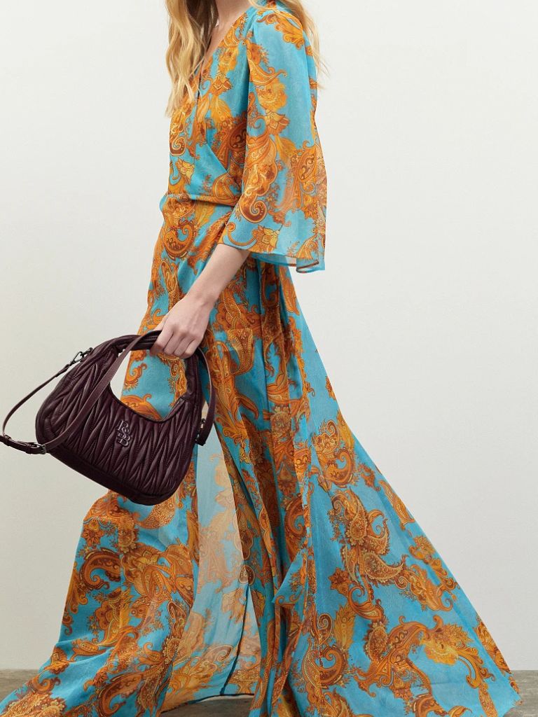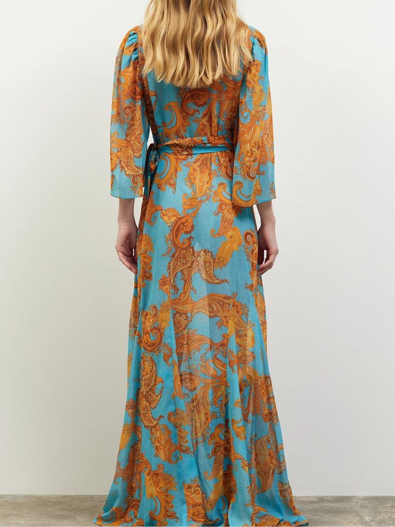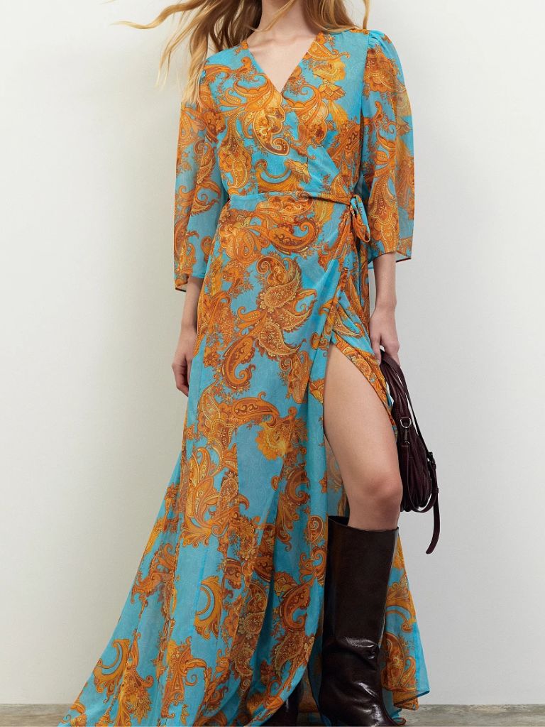 Μάξι φόρεμα εμπριμέ, με κρουαζέ δέσιμο. Διαθέτει μεσοφόρι και έχει κανονική εφαρμογή.