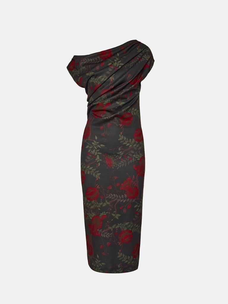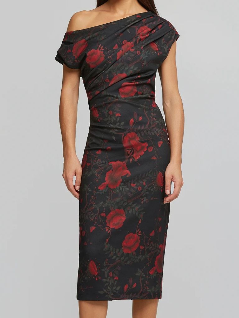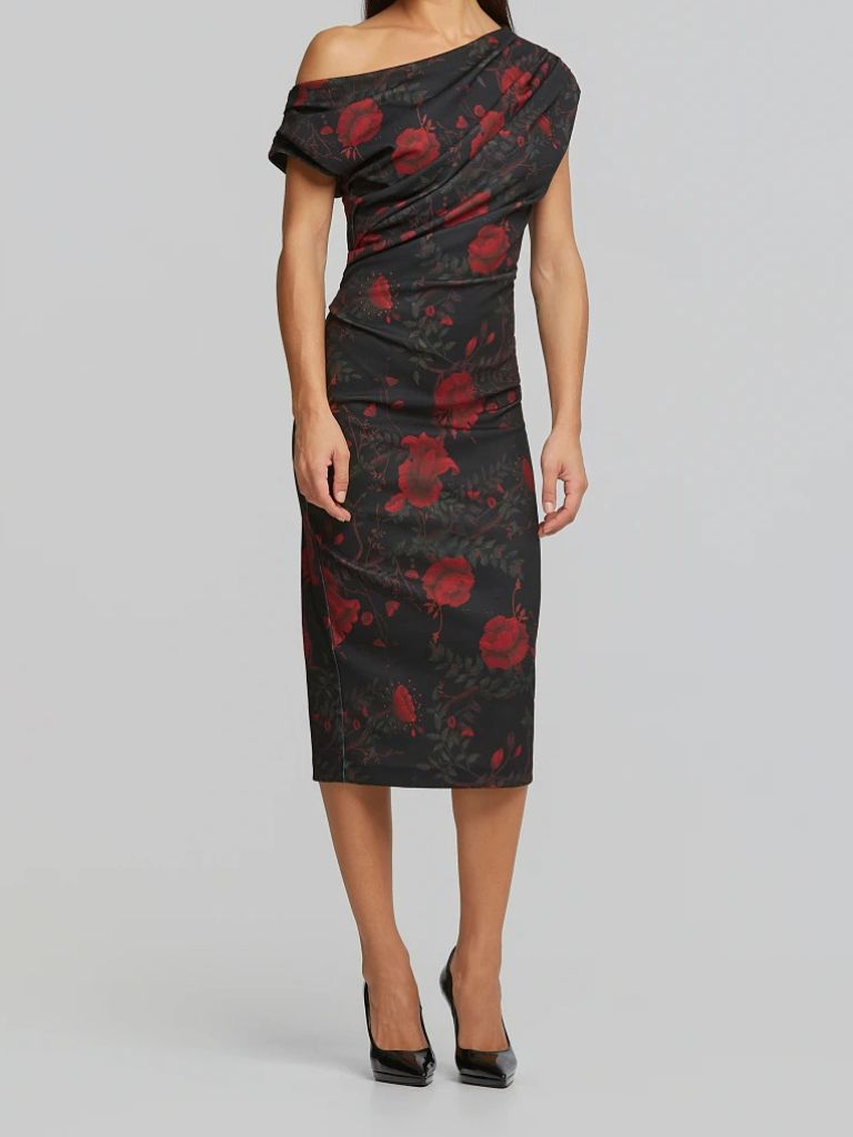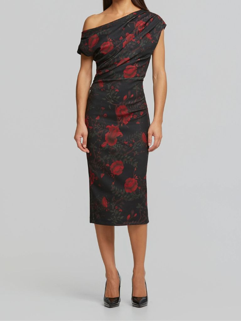 Εμπριμέ μίντι φόρεμα εφαρμοστό με ντραπέ λεπτομέρειες και πιέτες. Ασύμμετροι ώμοι και σκίσιμο πίσω.
