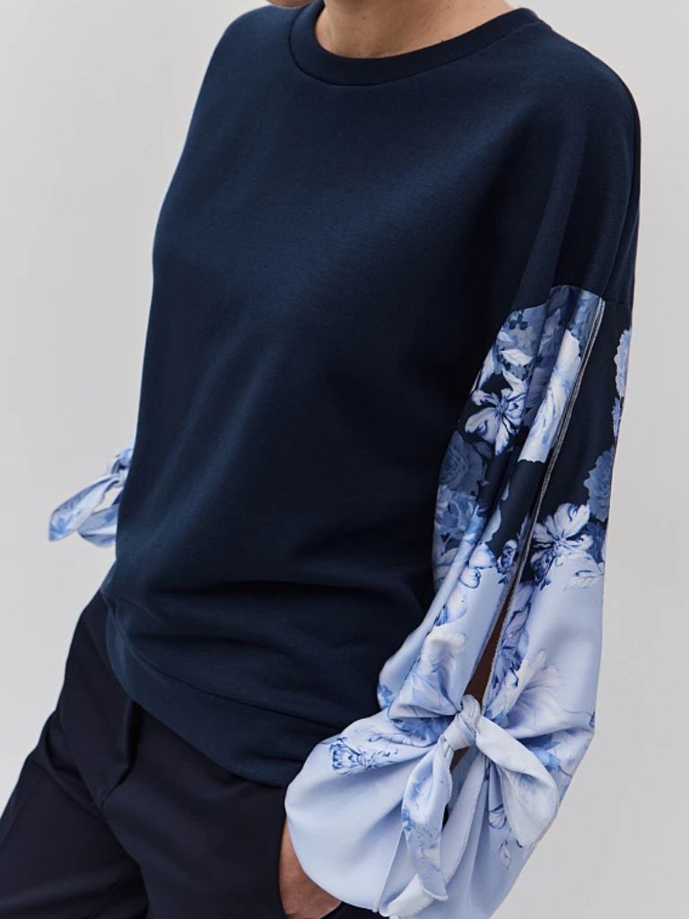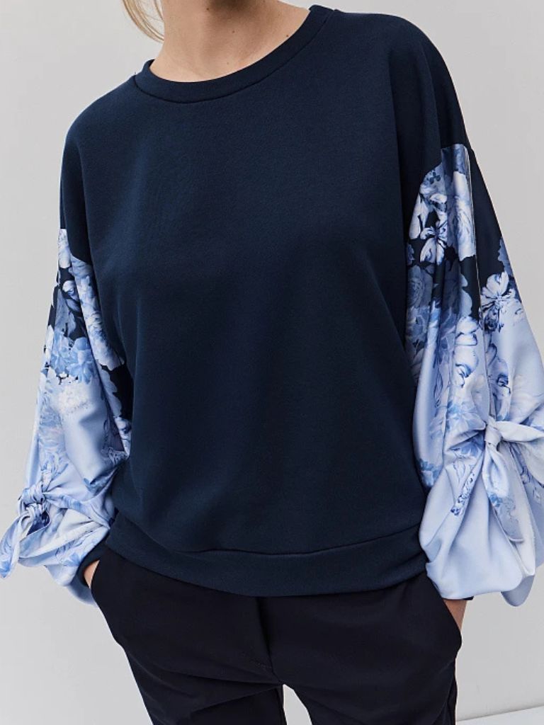Φούτερ μακρυμάνικο, με στρογγυλή λαιμόκοψη, με σατέν φλοράλ μανίκια, balloon μανίκια με cut out και δέσιμο, κανονική εφαρμογή, βαμβακερή υφή.