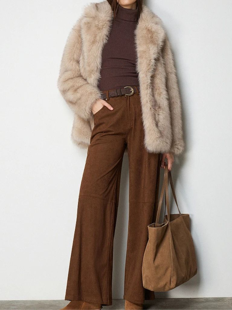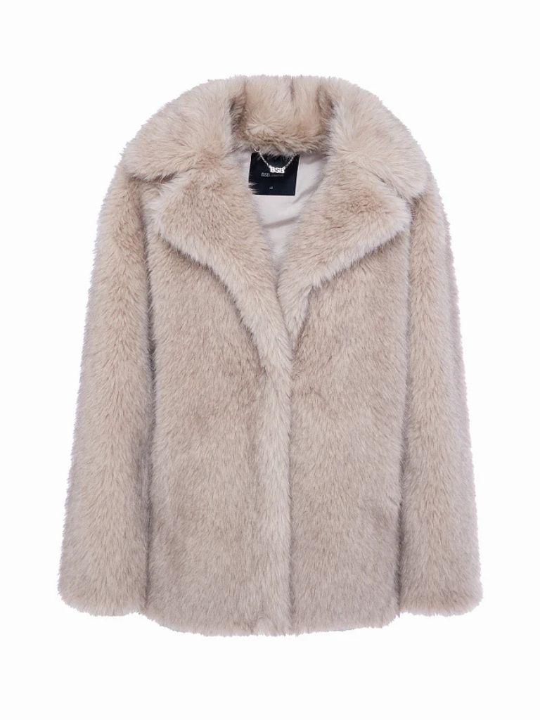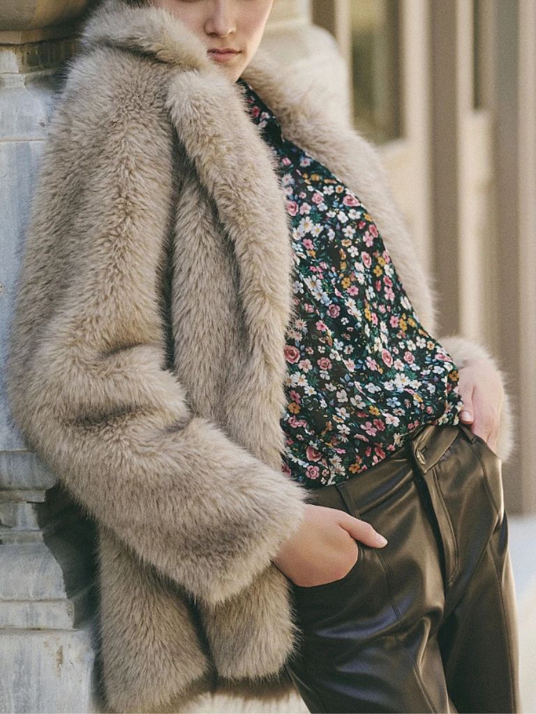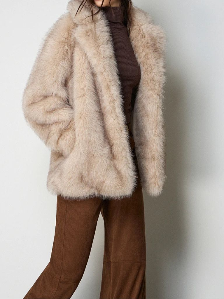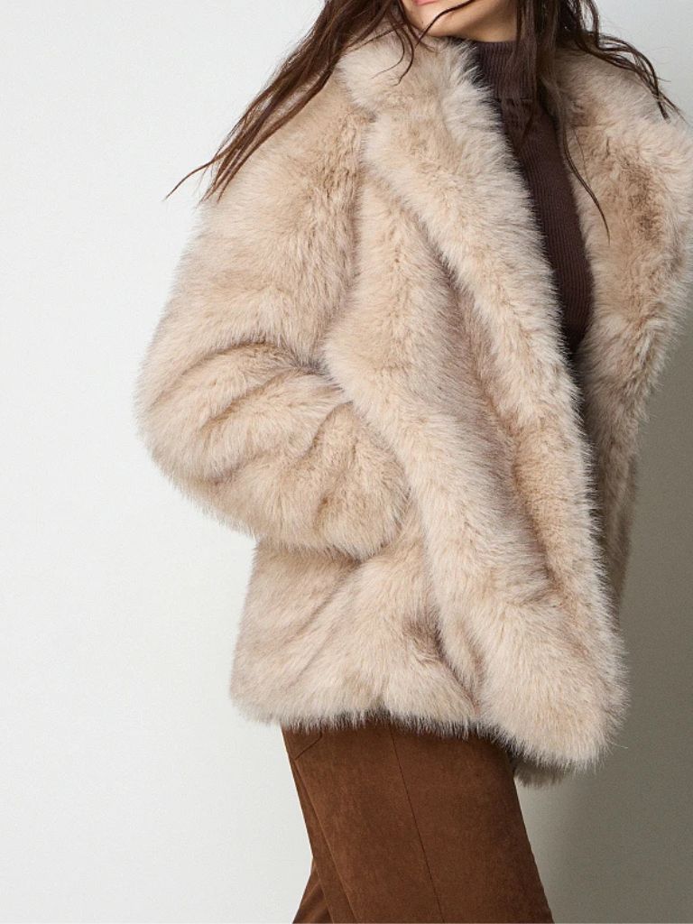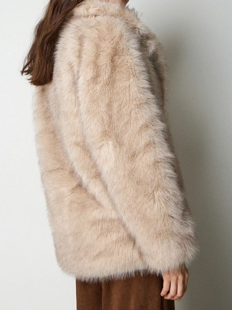 Κοντή συνθετική γούνα, με γιακά. Κλείσιμο με κόπιτσες, με κανονική εφαρμογή.