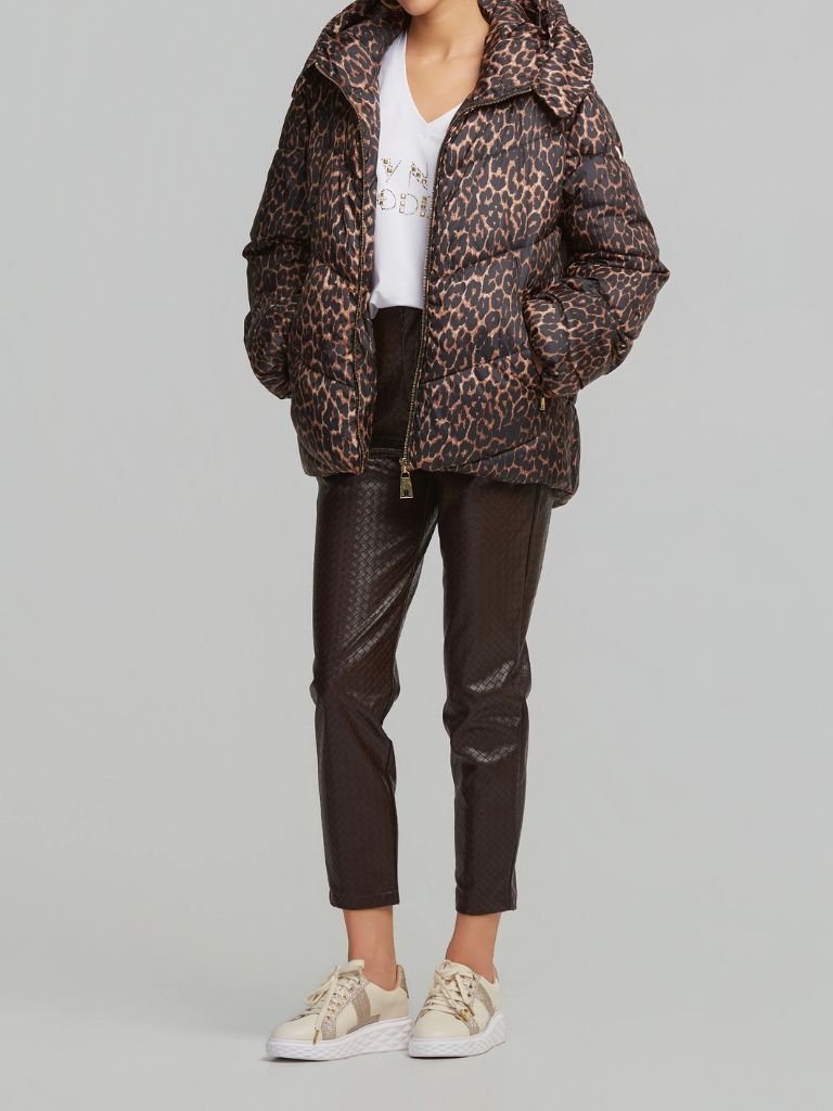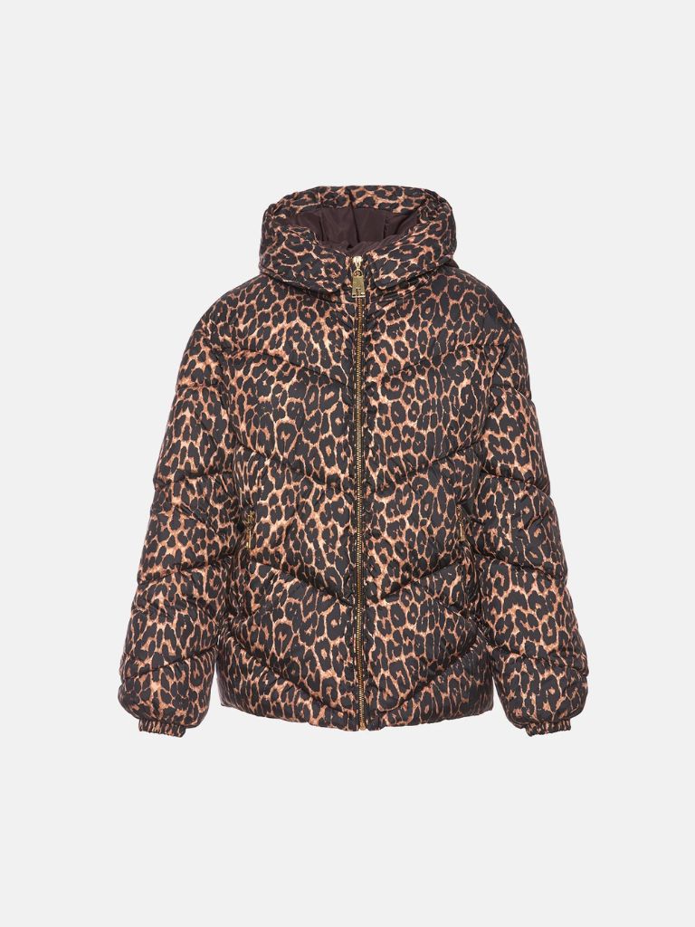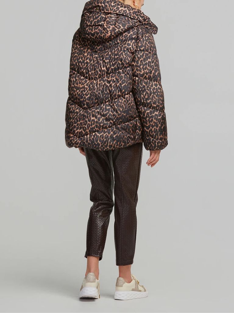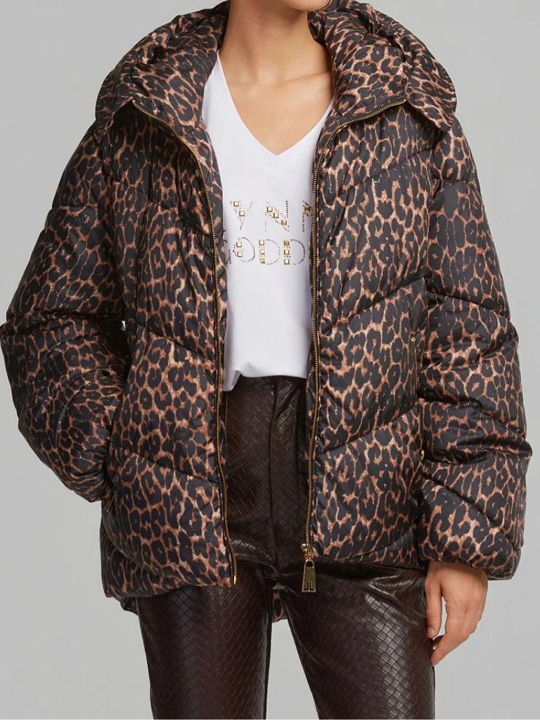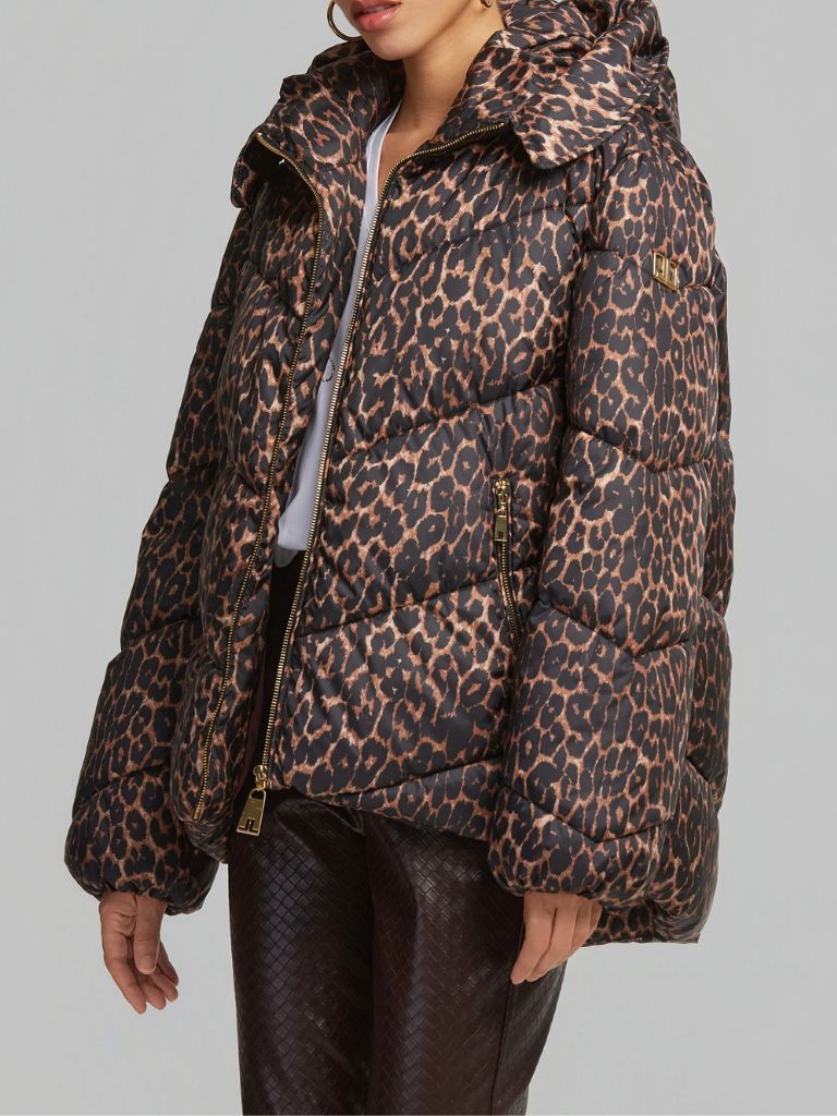 Λέοπαρ μπουφάν με ψηλό γιακά και κλείσιμο με φερμουάρ. Πλαϊνές τσέπες, με εσωτερική επένδυση και κανονική εφαρμογή.