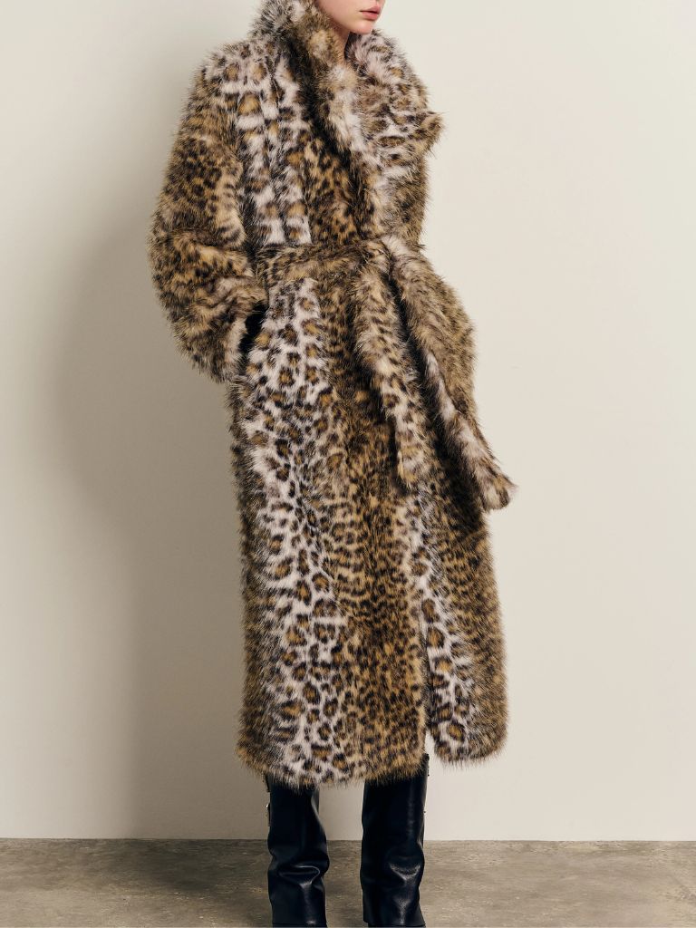 Μακριά συνθετική γούνα, με γιακά και δέσιμο με ασορτί ζώνη. Αnimal print, με  απαλή υφή και άνετη εφαρμογή.