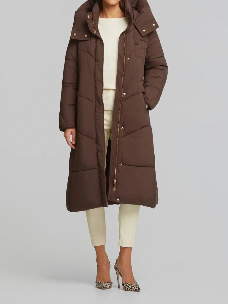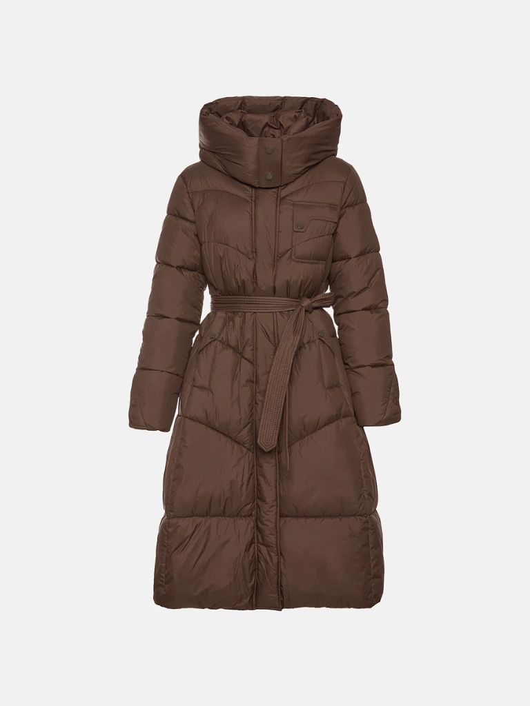 Μακρύ μπουφάν με κουκούλα και αποσπώμενη ζώνη. Πλαϊνές τσέπες και ψηλός γιακάς.