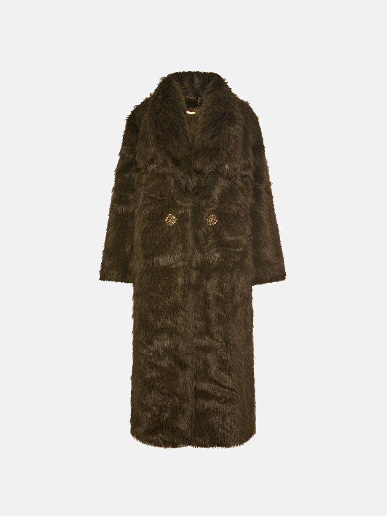 Μακρύ παλτό με όψη γούνας και κουμπιά από κρύσταλλα. Πλαϊνές τσέπες με άνετη εφαρμογή.
