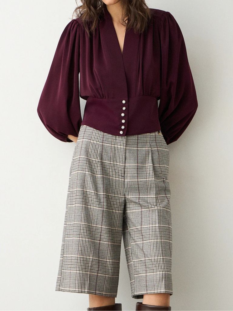 Μακρυμάνικη μπλούζα, με βάτες στους ώμους. Κλείσιμο με κουμπιά κόσμημα στη μέση, με κανονική εφαρμογή.Έιναι μεσάτη με ελαστική μέση και σατέν υφή.