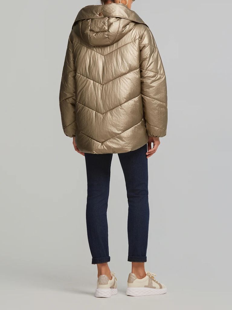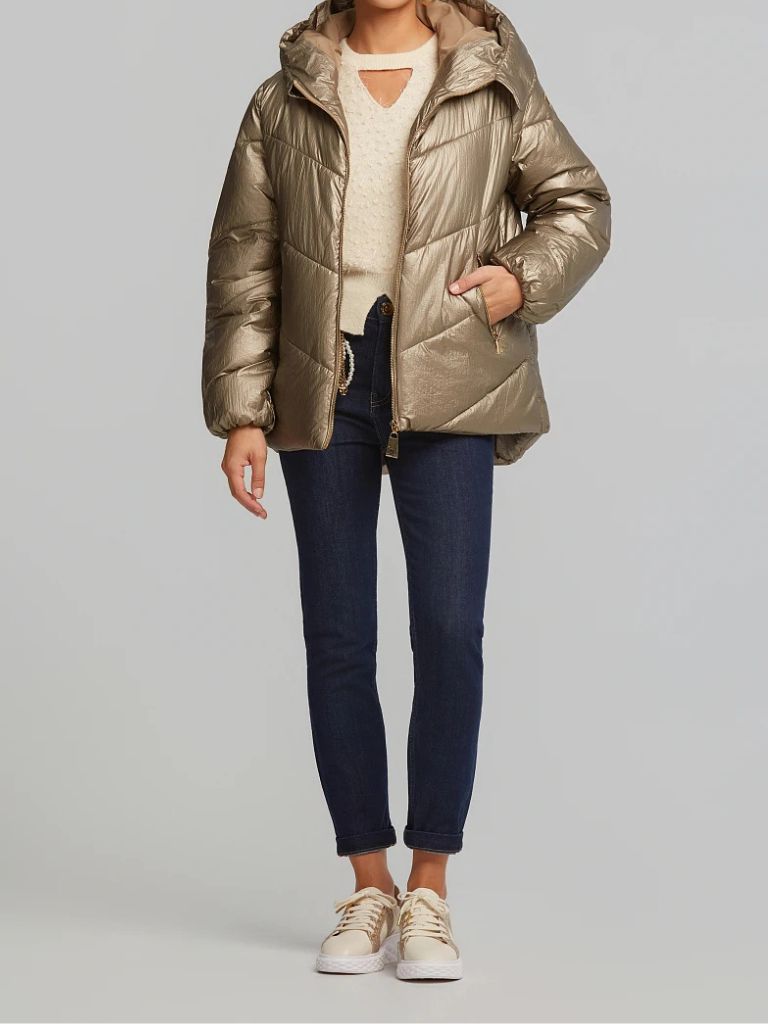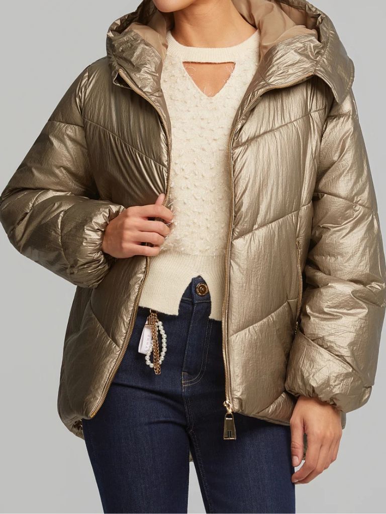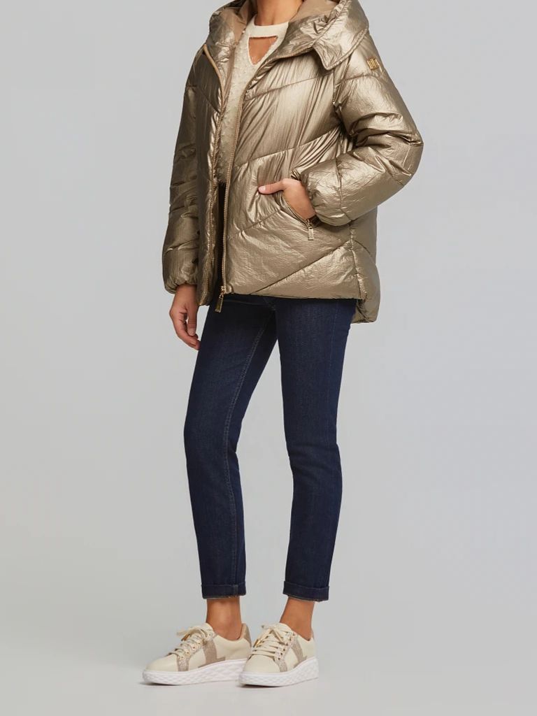 - Μεταλλιζέ μπουφάν με εσωτερική κουκούλα αποθήκευσης στο γιακά, κλείσιμο με φερμουάρ.