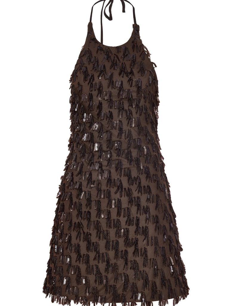 Μίνι φόρεμα, εξώπλατο, με δέσιμο στο λαιμό. Κλείσιμο με φερμουάρ στο πίσω μέρος, με παγιέτες και με κανονική εφαρμογή.