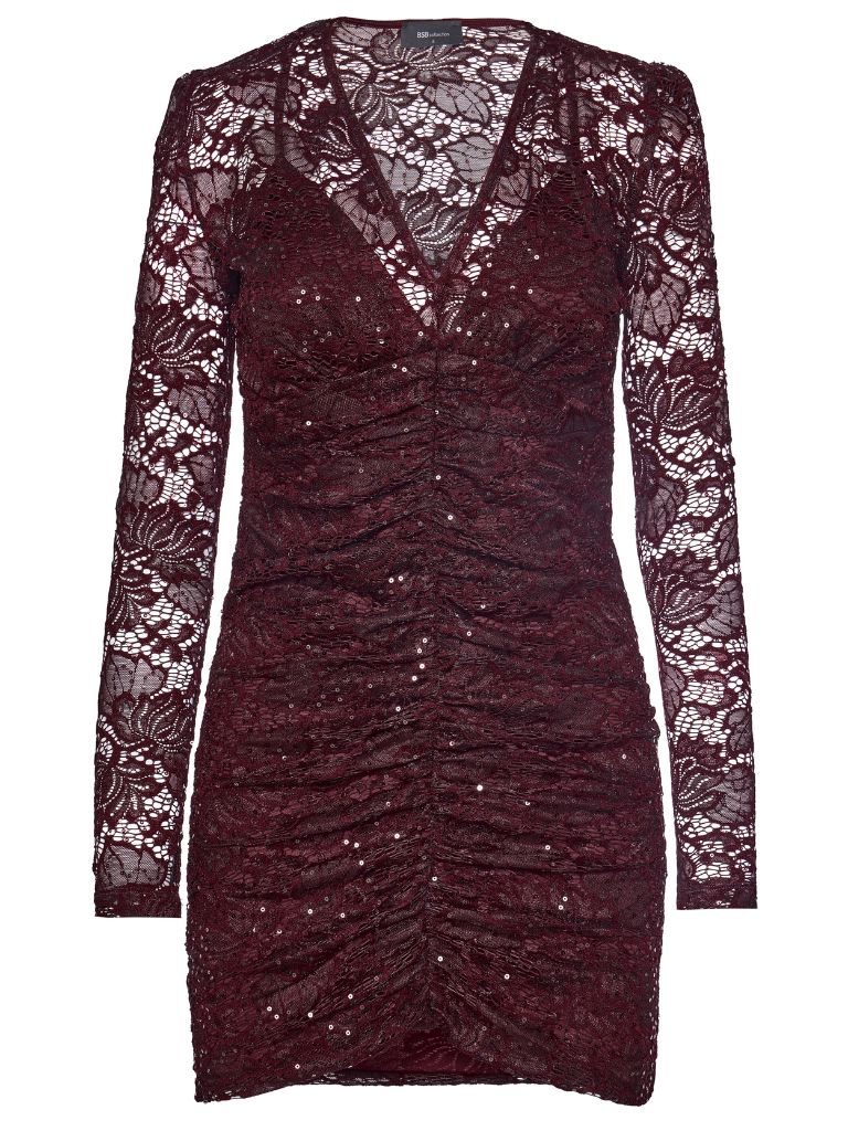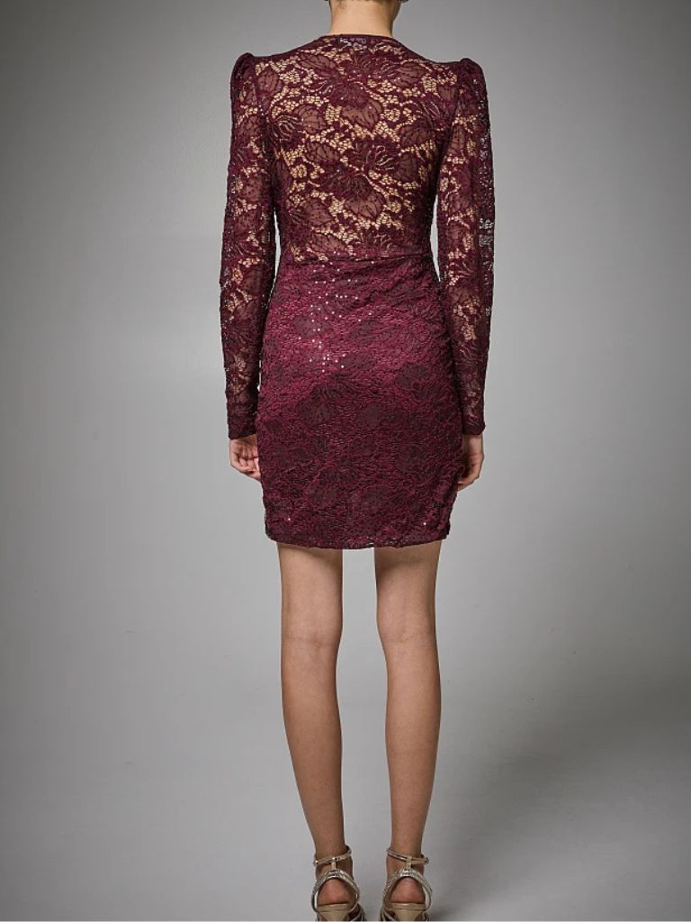 Μίνι μακρυμάνικο φόρεμα, δαντελωτό, διάτρητο, με σούρες. Με παγιέτες, ελαστικό και εφαρμοστό.