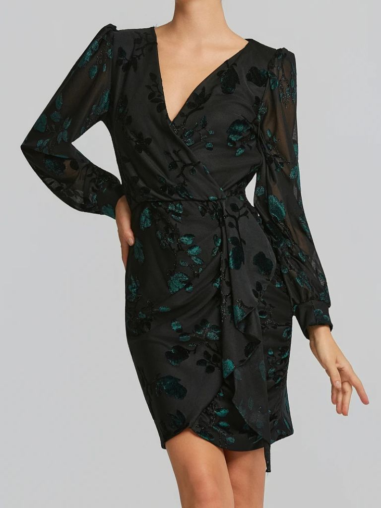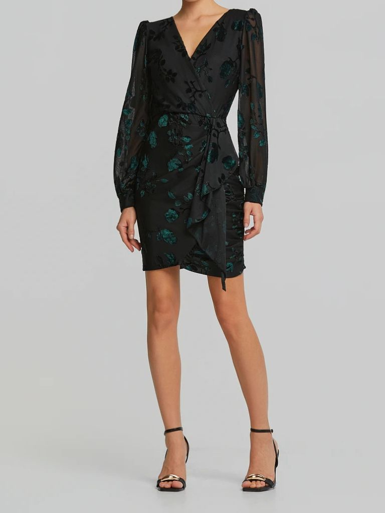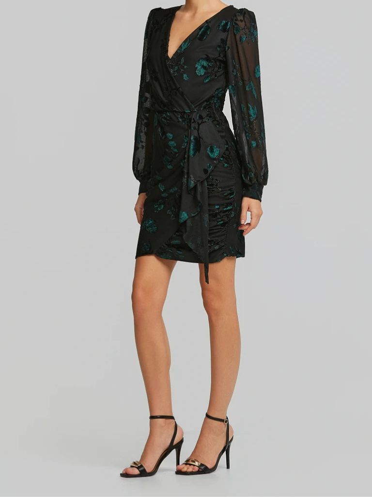 Μίνι φόρεμα σε devore εμπριμέ ύφασμα με έντονα μανίκια. Ασύμμετρο τελείωμα, βολάν και ελαστική μέση.