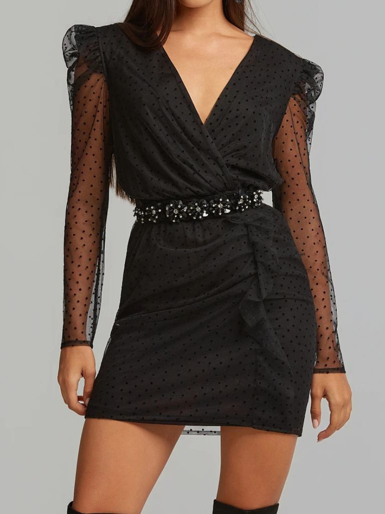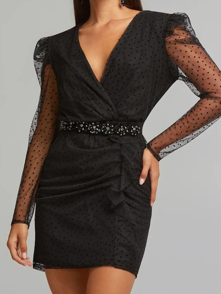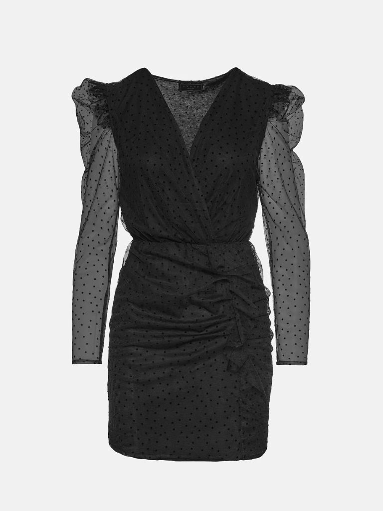 Μίνι πουά φόρεμα από τούλι με έντονα μανίκια. V λαιμόκοψη, με σούρες και ελαστική μέση.