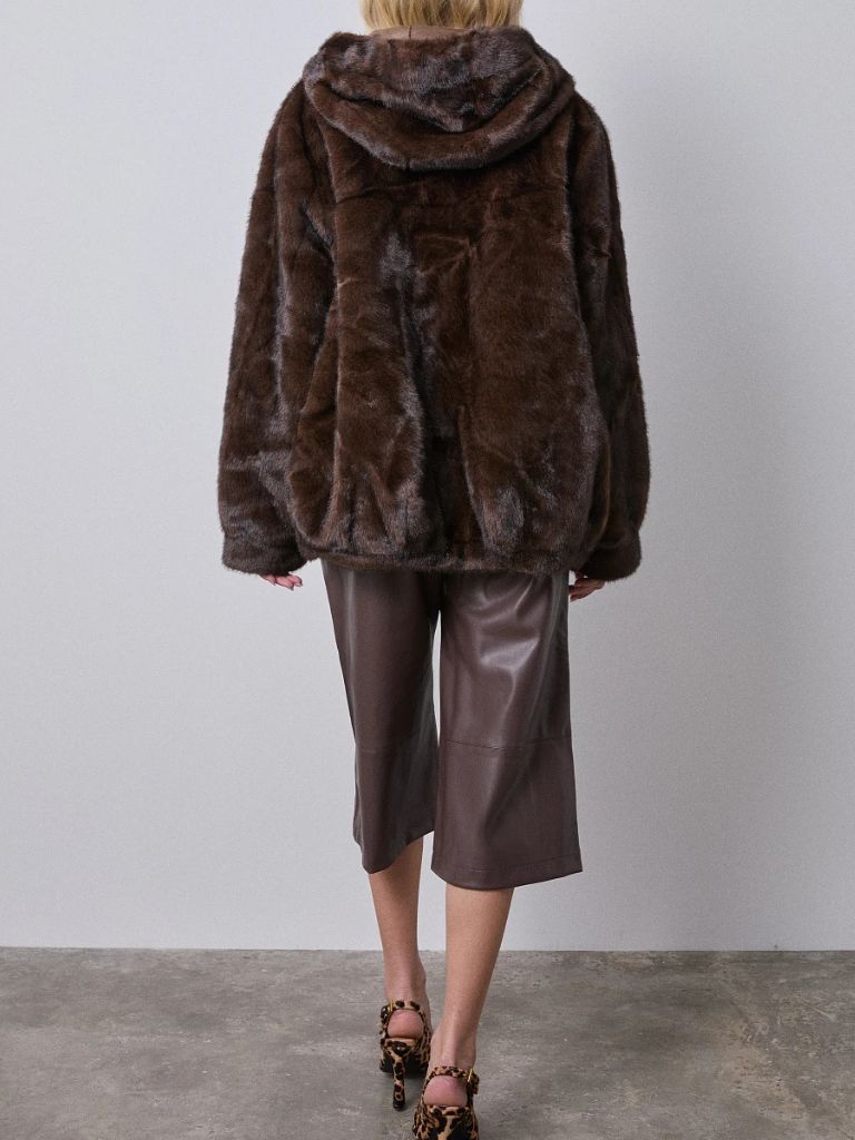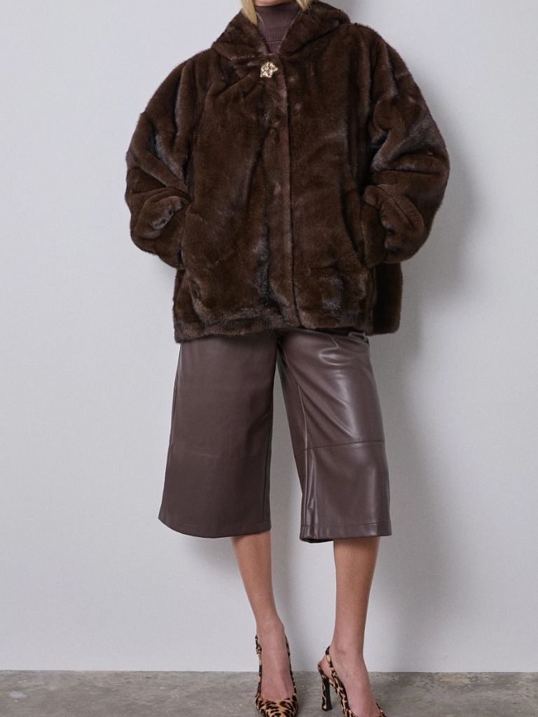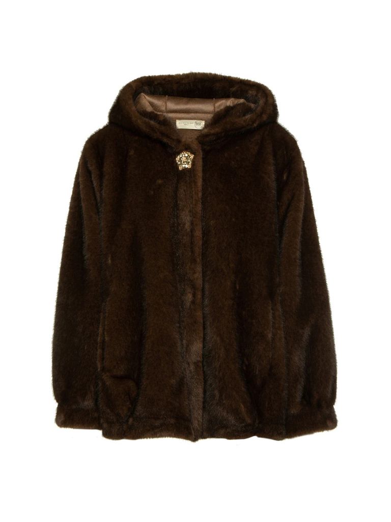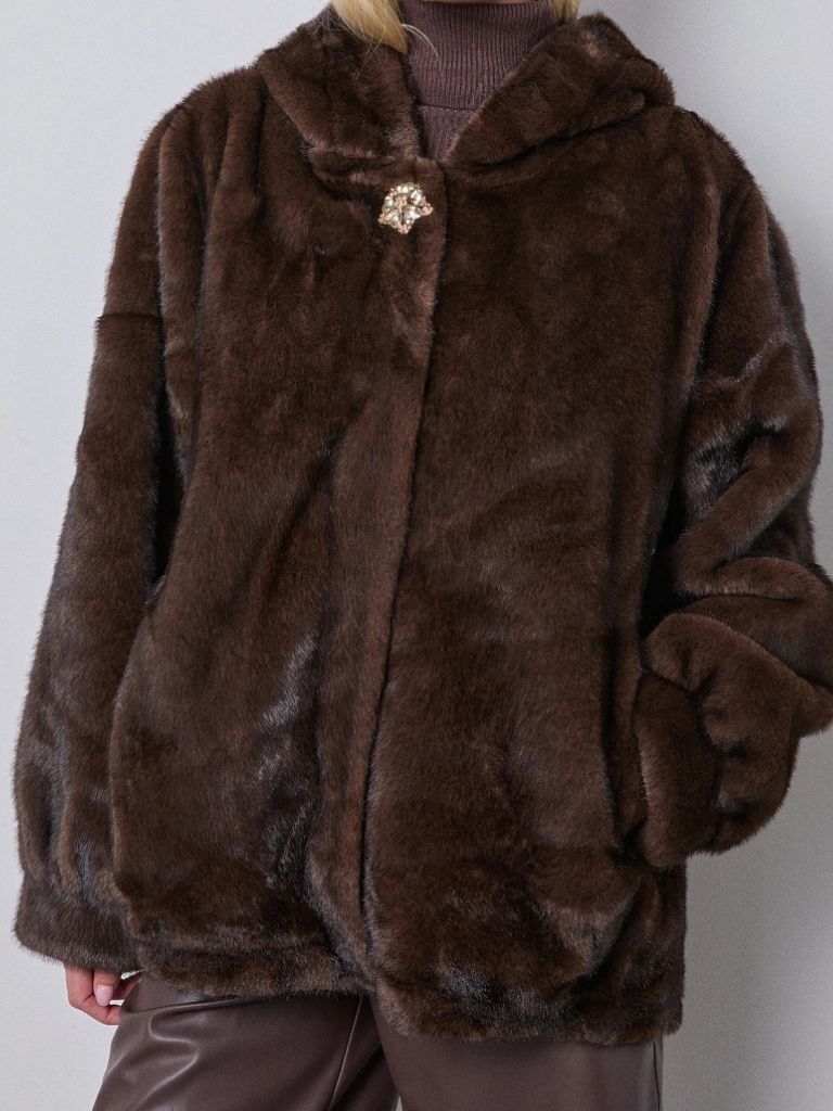 Συνθετική γούνα, μακρυμάνικη, με κουκούλα. Έχει κουμπιά κόσμημα με κανονική εφαρμογή και απαλή υφή.