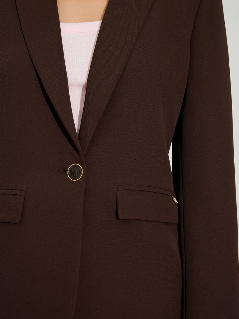 Βασικό σακάκι, με βάτες στους ώμους. Κλείσιμο με ανάγλυφο κουμπί, με πέτο και γιακά. Διακοσμητικές τσέπες, έχει κανονική εφαρμογή.